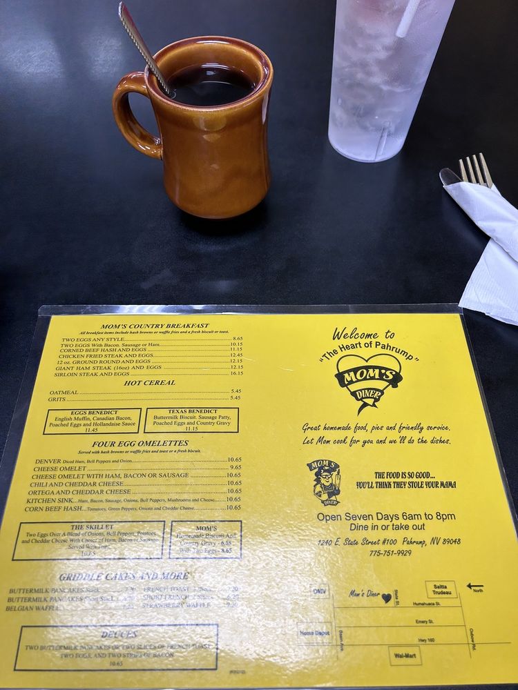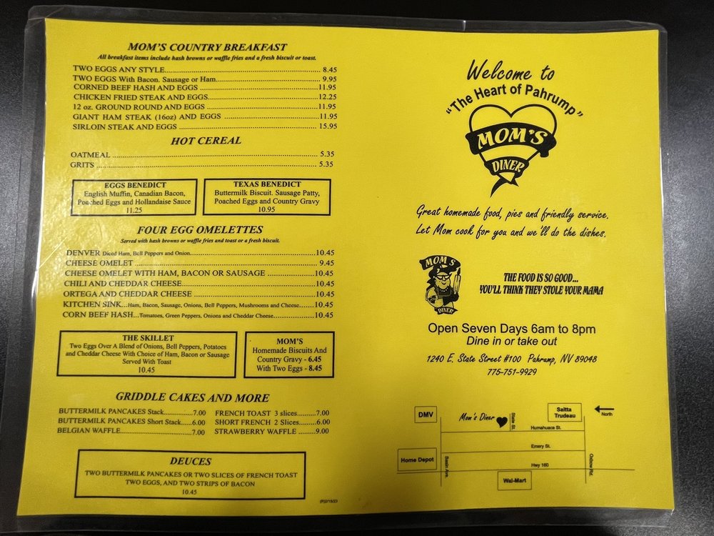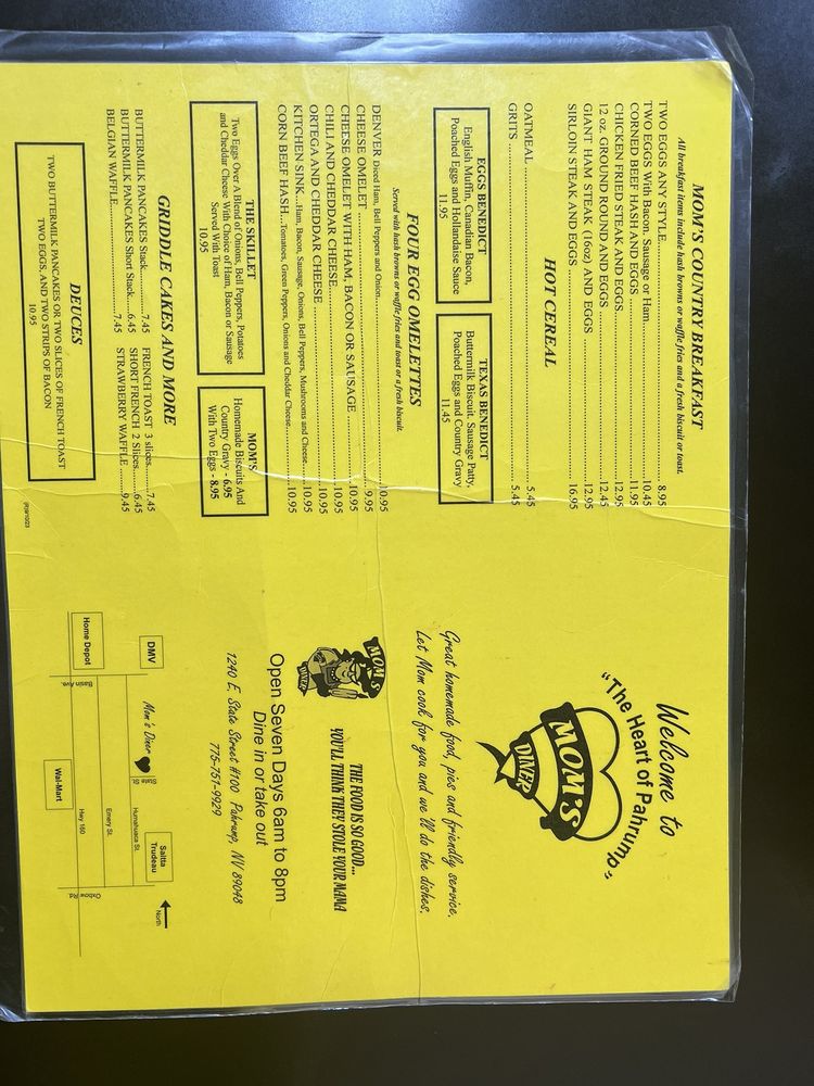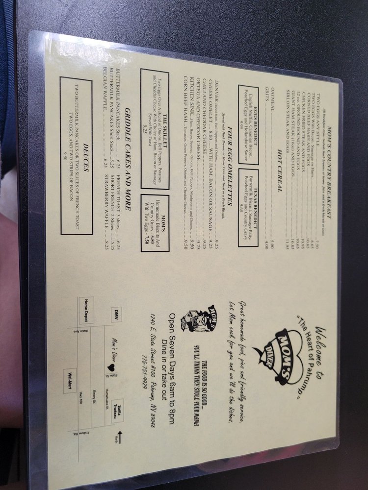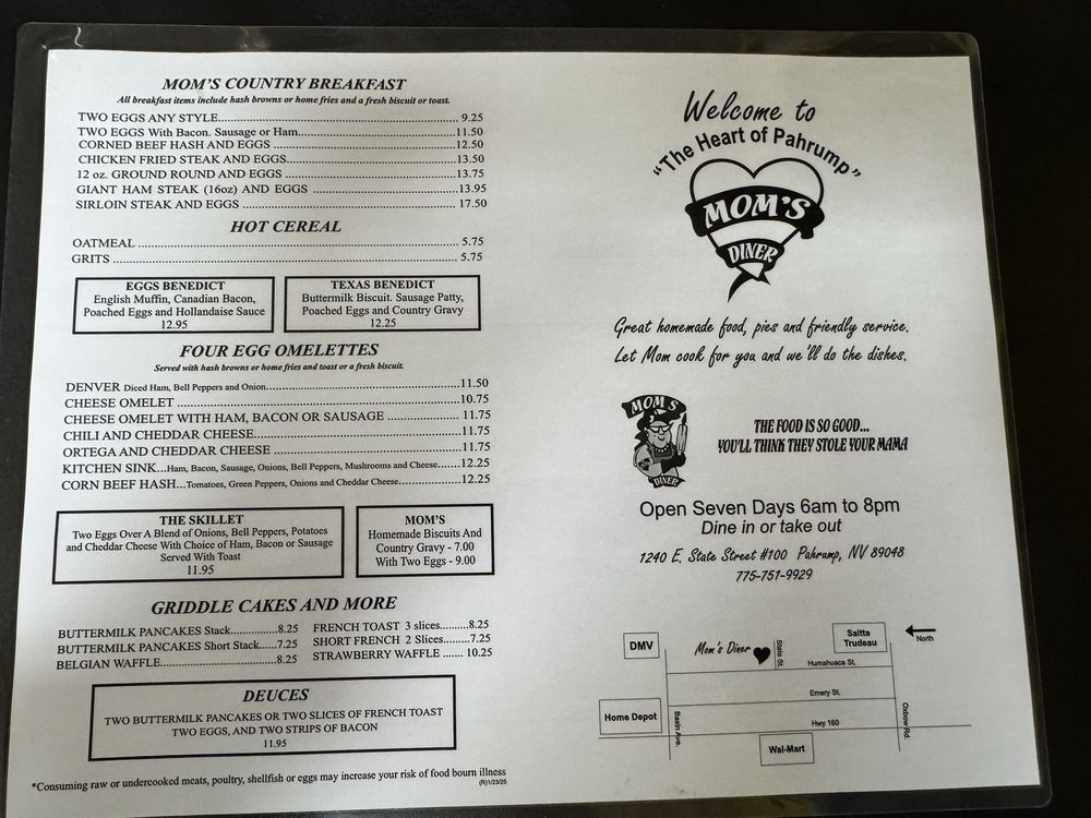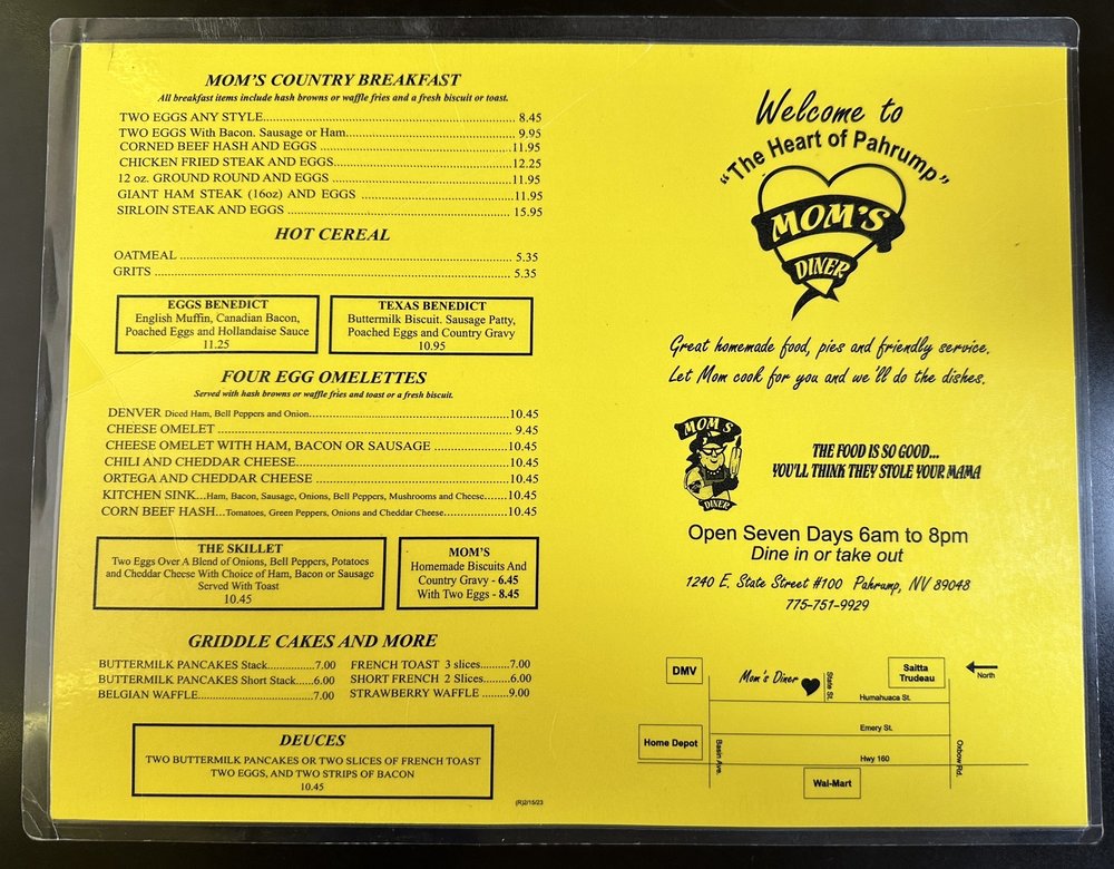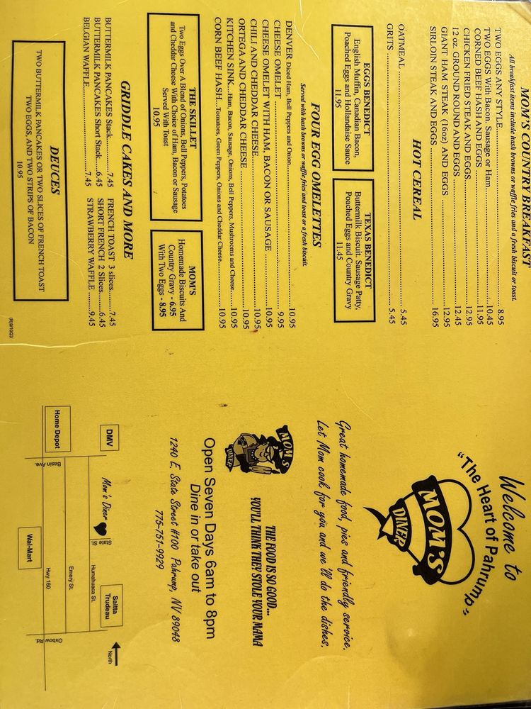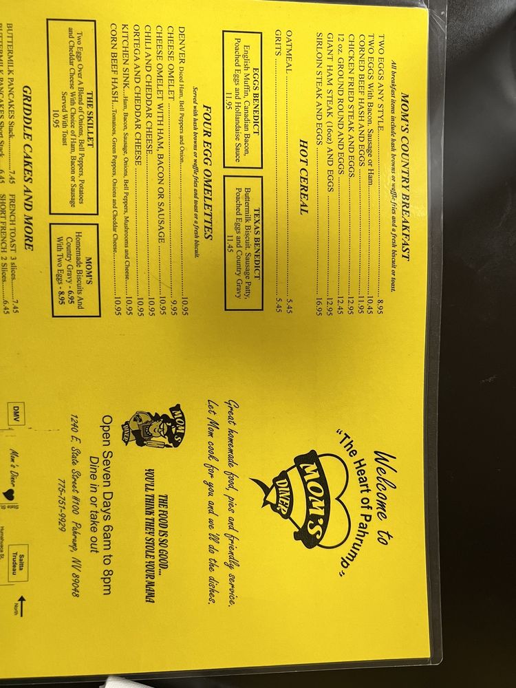 Introducing Mom’s Diner, an American-style diner located in Pahrump, NV, offering a cozy and welcoming atmosphere for breakfast, brunch, lunch, and dinner. The diner provides a range of amenities such as takeout, delivery, wheelchair accessibility, outdoor seating, and more. Known for their homemade cuisine, Mom’s Diner has received praise from customers for their friendly staff, clean environment, and tasty dishes. Highlights include the Texas Benedict with a side of hash browns and the signature "Moms Monstrosity" dish. The diverse decor adds a unique touch to the dining experience, ranging from Route 66 to automotive culture themes. If you're in the area, Mom’s Diner is a must-visit spot for a delicious meal in a charming setting.